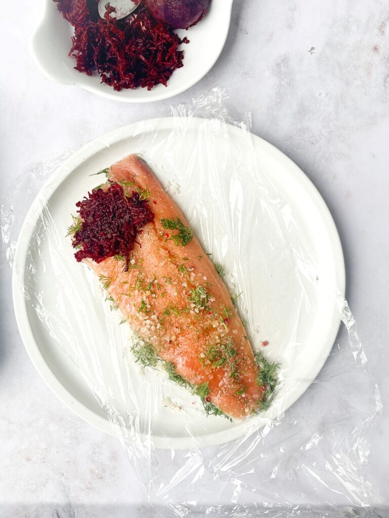 La recette est ultra-facile, presque impossible à oublier : 10 % de gros sel par rapport au poids du filet. C’est la règle d’or. J’y ajoute une touche de sucre, un peu d’aneth, du poivre fraîchement moulu… et pour sublimer la chair délicate de la truite tout en lui offrant une couleur éclatante, j’incorpore de la betterave crue finement râpée. Elle apporte une note légèrement terreuse, une belle teinte rubis et transforme le gravlax en véritable petit bijou visuel.